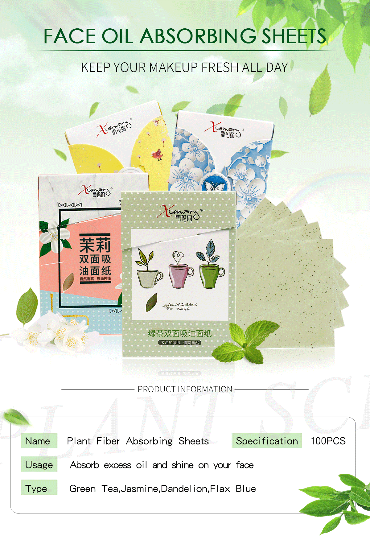 Material: Green tea/Jasmine/Dandelion/Flax blue